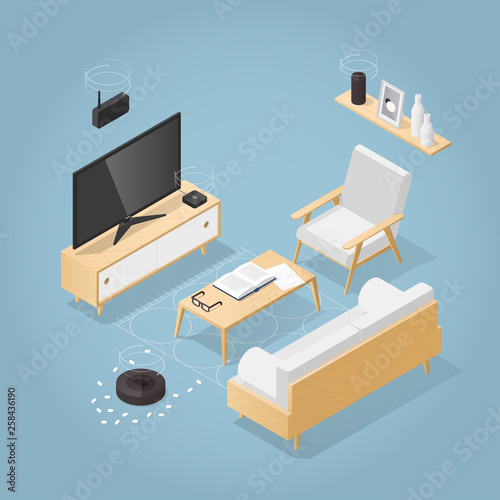 isometric, smart, home, hub, device, assistant, voice, house, technology, illustration, control, system, electronic, wireless, automation, concept, automated, living, room, electricity, modern, remote, digital, innovation, device, wi-fi, monitoring, comfort, television, tuner, vacuum, cleaner, robot, help, household, appliance, cyberspace, connection, intelligent, synchronization, furniture, space, automatic, communication, lamp, network, app, equipment, management, controller