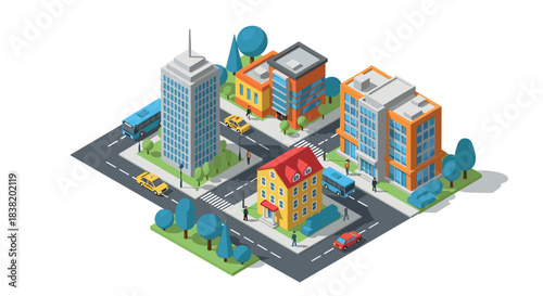 isometric, urban, city landscape, three-dimensional, building, architecture, street, car, modern, illustration, transportation, tree, landscape, intersection, skyscraper, residential, vibrant, colourful, perspective, design, traffic, downtown, commercial, environment, public transport, neighbourhood, community, office, urban life, infrastructure, development, clean, organised