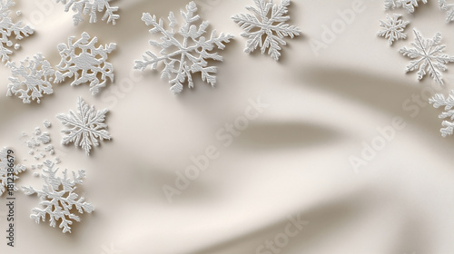 Isometric vector design, seamless elegant pattern, silver embossed snowflakes on matte ivory texture, soft lighting and depth, luxurious minimalist holiday aesthetic
