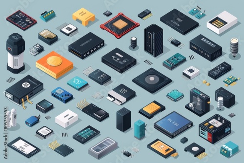 Isometric Vector Illustration of Electronic Component Icons, a Modern Collection for Tech Enthusiasts and UI Designers.