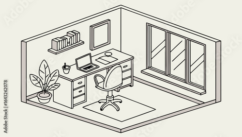 isometric, home office, desk, chair, laptop, window, minimalist, plant, bookshelf, artwork, rug, workspace, interior, furniture, modern, design, room, computer, cup, paper, office, study, drawing, vignetting, outline, decoration, indoor, contemporary, style, business, work, professional, creative, illustration, art, empty