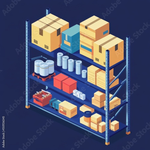 Isometric warehouse shelf filled with various cardboard boxes and supplies on blue background.