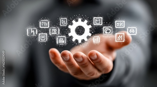 IT Consulting. Businessman holds digital consulting network connecting icon representing IT solutions, focusing on innovation, strategy, optimization, growth, and technology-driven success