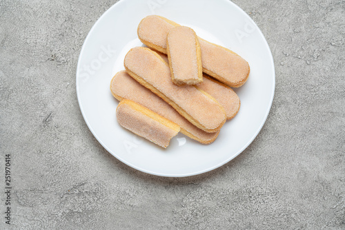 Italian Savoiardi ladyfingers Biscuits in plate on concrete backgound