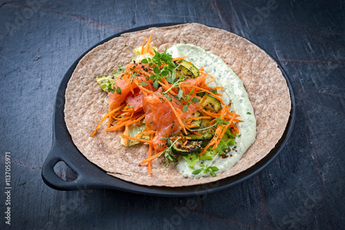 Italian style wrap piada tortilla with cured graved salmon, salad and zucchini served as close-up with avocado sour cream dressing dip on a Nordic Design plate