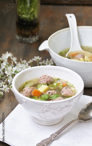 soup, food, bowl, vegetable, meal, dinner, healthy, lunch, cookery, chicken, cream, green, epicure, vegetable, meat, white, carrot, bread, dish, spoon, hot, delicious, broth, salad, tomatoes, italian food, white bowl, beautiful, meatball, meatball, wooden, table, plate, parsley