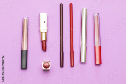 Items cosmetics for face on the lilac background