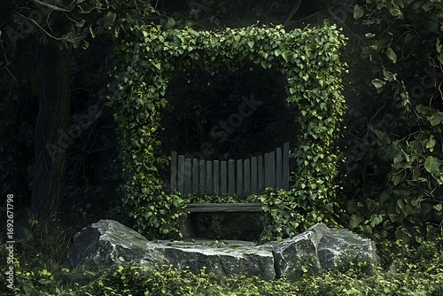 IvyCovered Wooden Bench Archway in Dark Forest with Stone Platform Base, Nature Scene