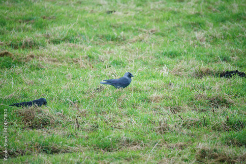 jackdaws (Corvus monedula) hunt for grubs in meadow grass