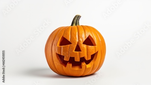 Jack-o-lantern pumpkin with carved face on white background, symbol of Halloween.