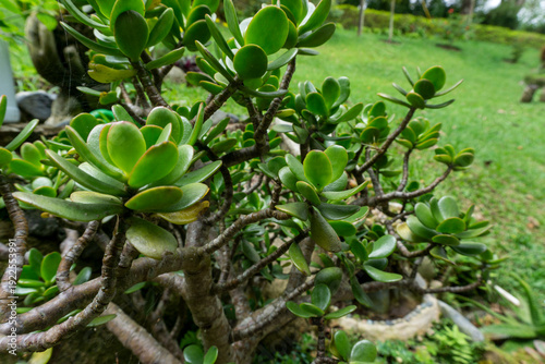 Jade plant or Crassula ovata with thick green succulent leaves in a garden, lucky money tree growing outdoors, botanical photography for home and prosperity.