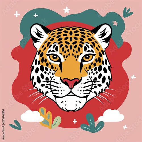 jaguar, head, plain, red, background, childish, style, illustration, leopard, cat, animal, wildlife, predator, wild, mammal, zoo, nature, felino, spot, fur, amur, panthera, big, carnivore, safari, hunter, panther, spotted, dangerous, big cat, portrait, animal