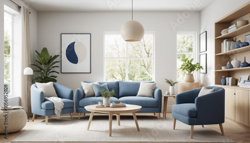 Japandi Minimalist Interior with Blue Art and Modern Blue Sofa in a Stylish Living Room.