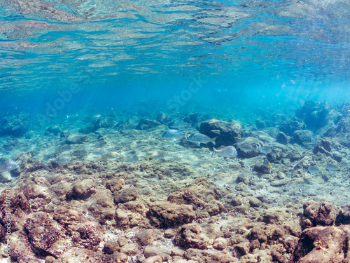 浅瀬に集う、美しく大きなクロダイ、アイゴ、メジナ他の群れの半水面撮影。 英名学名:Japanese Black Sea Bream (Acanthopagrus schlegelii), Rabbitfish (Siganus fuscescens), Largescale Blackfish (Girella punctata) 静岡県伊豆半島賀茂郡南伊豆町中木ヒリゾ浜2024年