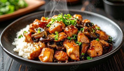asian cuisine, stir fry, mushroom, soy sauce, food, meal, meat, dish, dinner, plate, chicken, cookery, vegetable