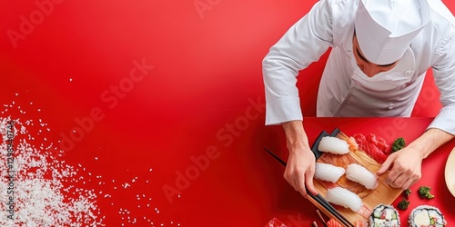 Japanese sushi chef demonstrates sushi, space for text on the right.
