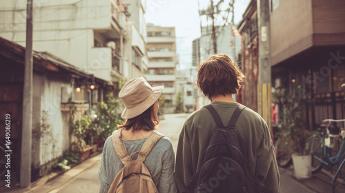 couple, travel, tokyo, japan, street, photo, vacation, backpacking, adventure, tour tourism, city, urban, people, woman, man, hat, backpack, building, architecture, road, alley, style, fashion, culture, lifestyle, destination, explore, sightseeing, journey, trip, holiday, leisure, recreation, daytime, outdoors, walking, together, back, view, asia