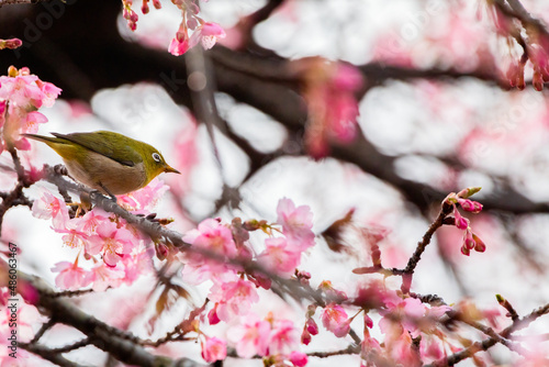 Japanese White-eye and Cerasus lannesiana Carriere at Shibuya, Tokyo, Japan