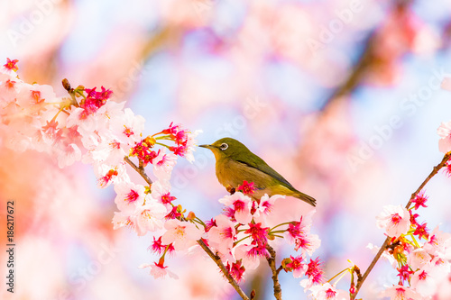 Japanese White-eye.The background is cherry blossoms. Located in Tokyo Prefecture Japan.
