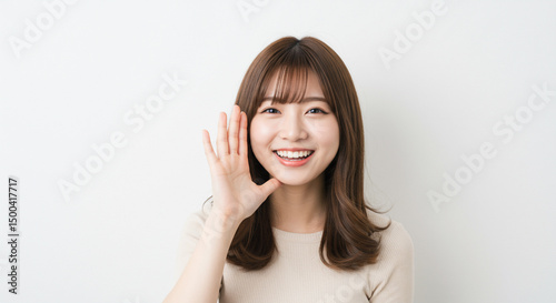 japanese woman calling out with smile, waving at camera on white background, with copy space