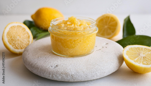 Jar of lemon body scrub. Skin care routine. Homemade cosmetics. Beauty product