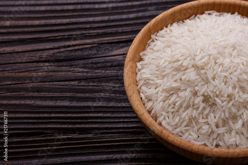 Jasmine rice on a wooden rustic background