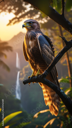 Javan Hawk on its habitat, Javanese Forest, extinct animal sunset, tropical forest, river, created by generative ai