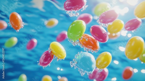 Jelly Bean Delight: A vibrant collection of colorful jelly beans floats gracefully in a crystal-clear aquatic environment, showcasing the playful allure of confectionery treats.