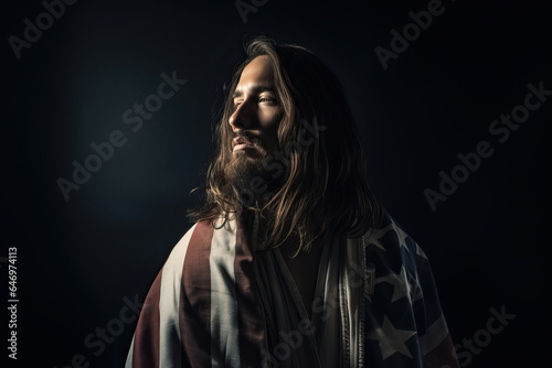 Jesus Christ draped in an American flag, long haired man with beard, shining heavenly light