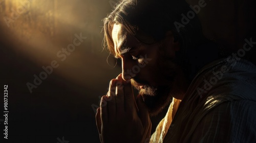 Jesus Christ in deep prayer, illuminated by a soft, heavenly light, symbolizing divine presence