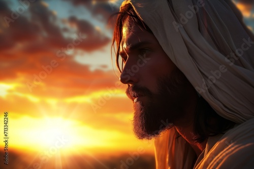 Jesus Christ Portrayed In White Robe During Breathtaking Sunset