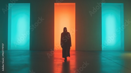 Jesus Christ. Silhouette of a man standing in front of an illuminated door. Conceptual image.