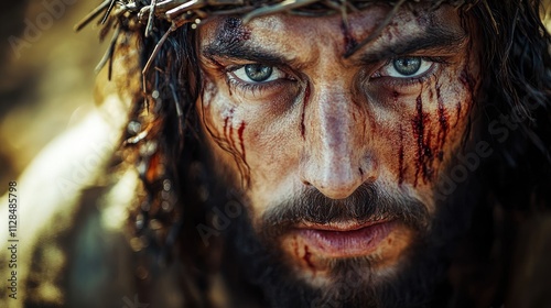 jesus christ with crown of thorns on his head photorealistic portrait close up