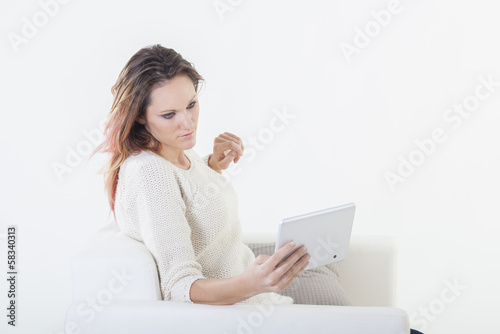 missy, teenage, adult, appearance, appreciate, cute, couch, hair, communication, communicate, relaxed, nonchalant, woman, girl, happy, cyberspace, interior, young, happy, house, messaging, mobile, modern, digital, computer, person, portrait, look, sofa, smiling, smile, surf, tablet, technology, holding, touch screen, sitting