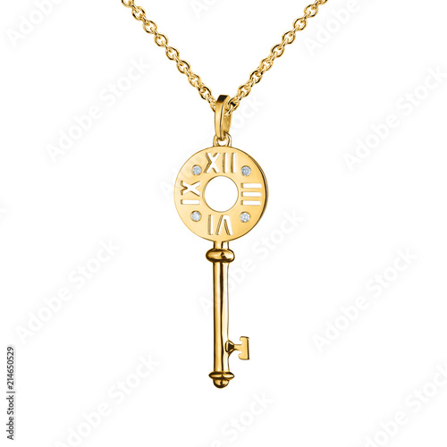 Jewelry golden pendant with diamonds, key with watch marks, golden chain, yellow gold, isolated on white