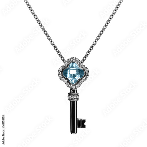 Jewelry key pendant with diamonds and blue aquamarine, chain