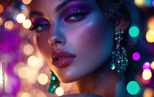 Jewel-Toned Elegance A vibrant portrait of a woman with jewel-toned purple eyeshadow and emerald eyeliner. She wears chandelier earrings and is surrounded by glowing jewel-toned holiday lights.