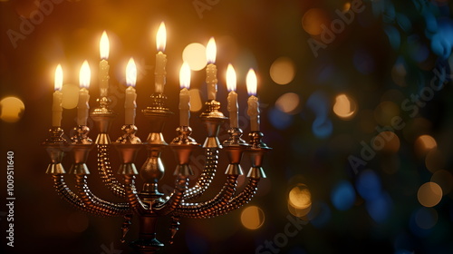 Jewish Hanukkah menorah with nine candles on a festive background with glowing lights.