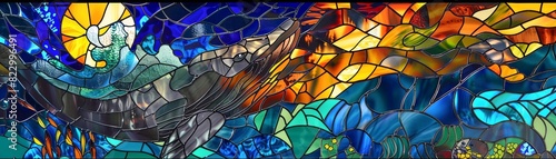 whale, stained, glasses, dynamic, depiction, deep, sea, blues, contrast, figure, artwork, design, biblical, story, colours, pattern, detail, religion, craftsmanship, imagery, creative, unique, stunning, window, illustration, christianity, narrative, artistic, vibrant, majestic, creation, symbolism, aesthetic, depth, expression, radiant, illumination, intricate, perspective, interpretation, breathtaking, elegance, masterpiece, spiritual, theme, dramatic, crafted, visual
