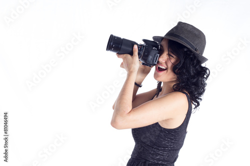 young, woman, photo, photographer, latin, latin, camera, charge, lens, objective, zoom, eye, face, portrait, sine, chest, pride, confidence, joy, motivation, inspiration, light, reflex, background, white, girl, fine-looking, art, journalism, journalist, ecuador, bolivia, venezuela, chili, happiness, happy, smile