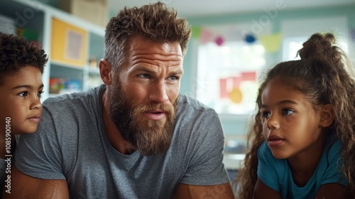 jovial father interacts with his two children in a colorful classroom, fostering a warm, engaging atmosphere full of curiosity and laughter as they explore educational activities together