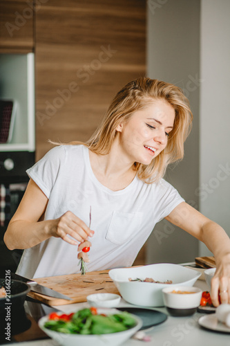 food, kitchen, salad, woman, female, people, young, beautiful, cooking, fresh, health, healthy, home, meal, vegetable, vegetarian, person, cutting, diet, girl, green, happy, lifestyle, nourishment, prepare, table, tomatoes, board, cook, cucumber, knife, light, cookery, vitamin, attractive, background, eating, drink, organic, delicious, bowl, vegetable, copy, chopping, cheerful, eat, chicken, chopping board, blond, fruit