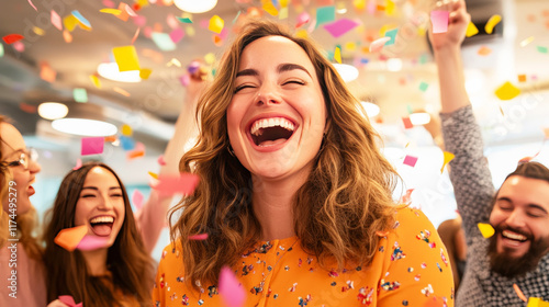 celebration, confetti, joy, happiness, party, fun, laughter, smile, woman, people, group, friends, colleague, festive, cheerful, vibrant, colourful, positive, energetic, excitement, event, gathering, togetherness, smiling, amusement, exhilaration, delight, jubilation, merriment, carefree, playful, team, teamwork, success, achievement, accomplishment, goodtime, mood, atmosphere, feeling