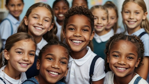 Joyful children in school uniforms with big smiles, grouped in a classroom, embodying diversity and the cheerful spirit of young friendships.
