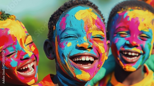 children, joy, laughter, face paint, colours, happiness, friendship, childhood, carefree, vibrant, innocence, togetherness, fun, celebration, vivid colors, summer, festival, art, candid, multicultural, natural light, storytelling, emotion, playtime, excitement, bonding, playful, cheerful, energy, youth, culture, imagination, adventure, diverse, joyfulness, lively, authenticity