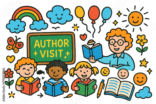 Joyful Classroom Creativity. Colorful Hand-drawn doodle Children illustration Classroom Author Visit chalkboard, author, children reading, open book, pen,