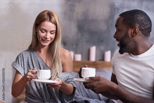 couple, joyful, young, international, eat, to sit, bedchamber, together, waist up, breakfast, tolerance, african, talk, american, race, emotion, love, relation, human relationships, care, morning, communication, bright, delighted, posing, rest, relaxed, cute, home, leisure, weekend, relaxation, lifestyle, casual attire, happy, people, domestic, apartment, modern, cosy, bedclothes, room, interior, day, house, several