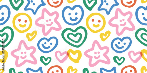 Joyful Doodles Pattern: a vibrant and whimsical collection of smiling stars, hearts, and smiley faces, showcasing a kaleidoscope of colors in a delightful display.