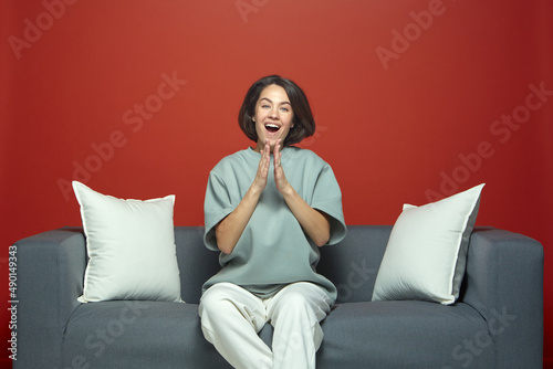 applause, clap, excited, girl, palm, hand, female, series, television, joyful, fan, gesture, support, spectator, award, concert, woman, emotional, beauty, young, expression, model, delight, brunette, caucasian, having fun, lifestyle, sitting, couch, attractive, glad, watching, beautiful, discount, succeed, casual attire, home, success, person, pretty, adult, cute, charming, adorable, promotion, advertisement, shopping, copy space, studio, sofa