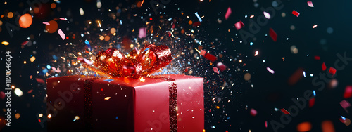 red, gift, box, exploding, confetti, vibrant, colours, glowing, sparkle, dynamic, trail, dark, background, sharp, contrast, motion, captured, festive, energy, celebration, scene, joyful, explosion, holiday, theme, magical, display, shimmering, particle, energetic, surprise, element, high-coloured, detail, celebratory, mood, visual, lighting, generative, ai, christmas, tree, decoration, christmas, candle, light, ornament